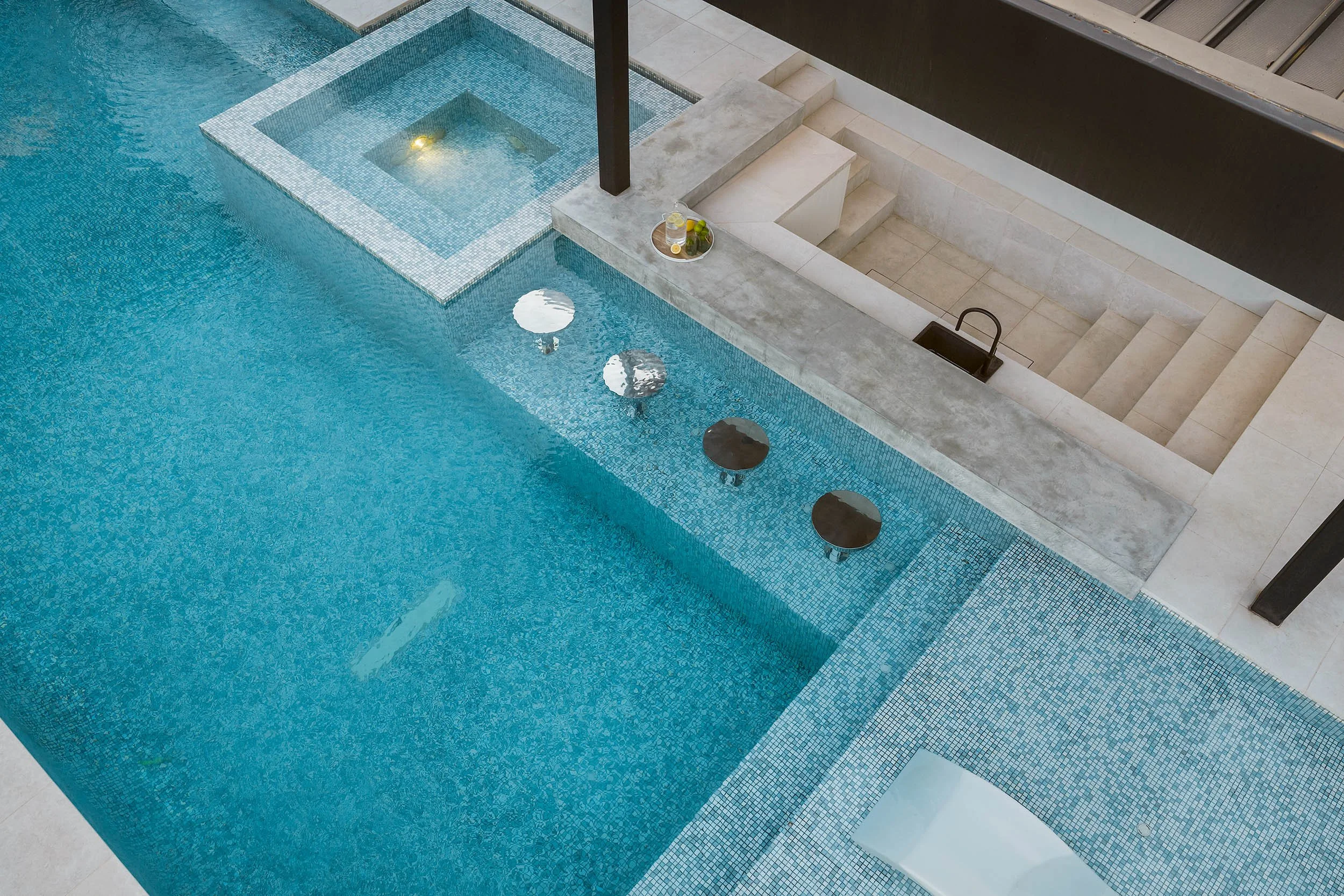The inclusion of a swim up pool bar was a direct response to the clients’ travels and their love of entertaining. Submerged bar seating allows guests to sit comfortably in the water while sharing drinks and conversation.