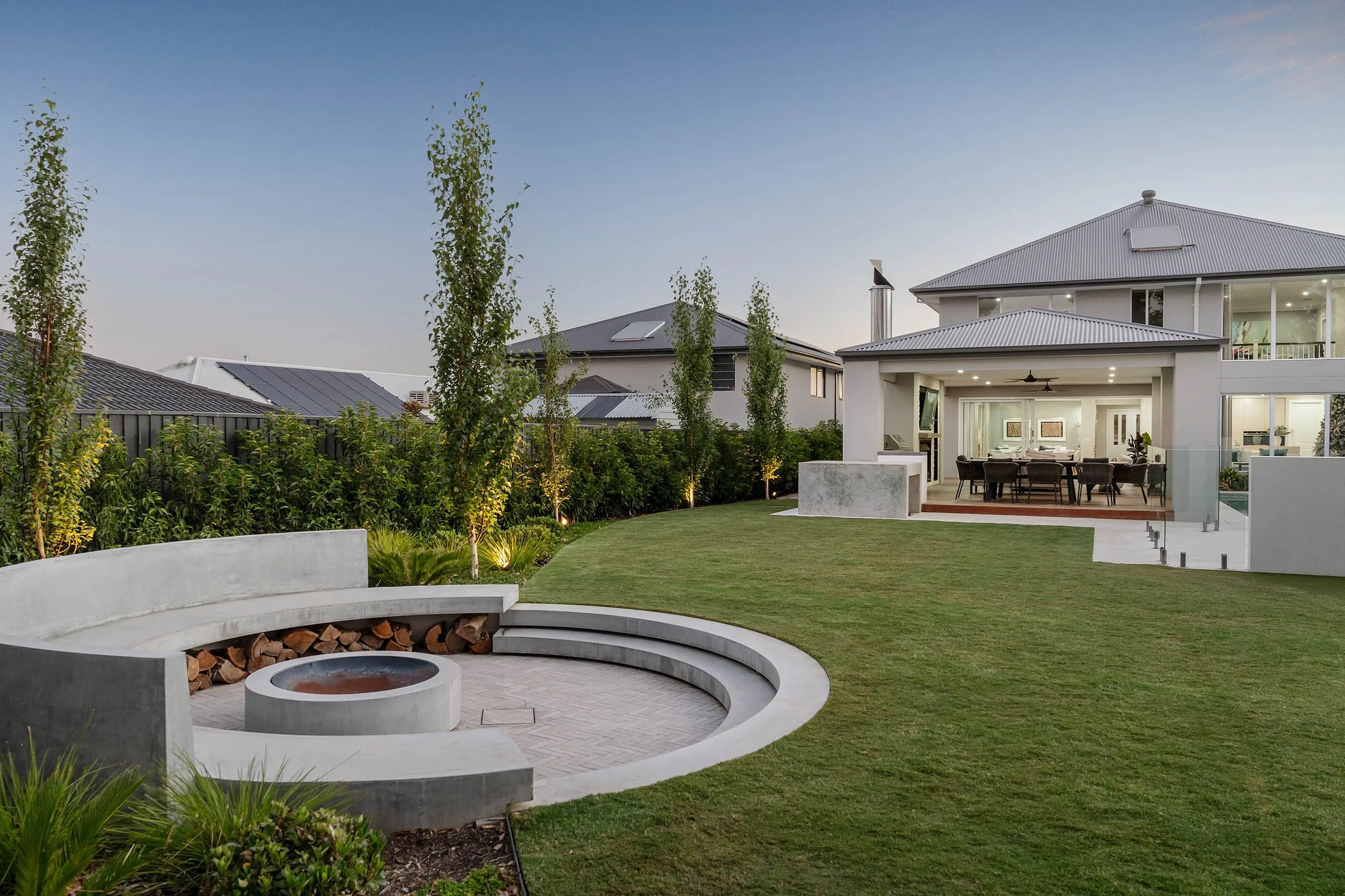 While the pool and alfresco spaces form the social heart of the garden, the design also introduces quieter areas for relaxation. One of the most distinctive is the backyard firepit area, formed by a curved concrete seating wall that wraps around the fire feature.
