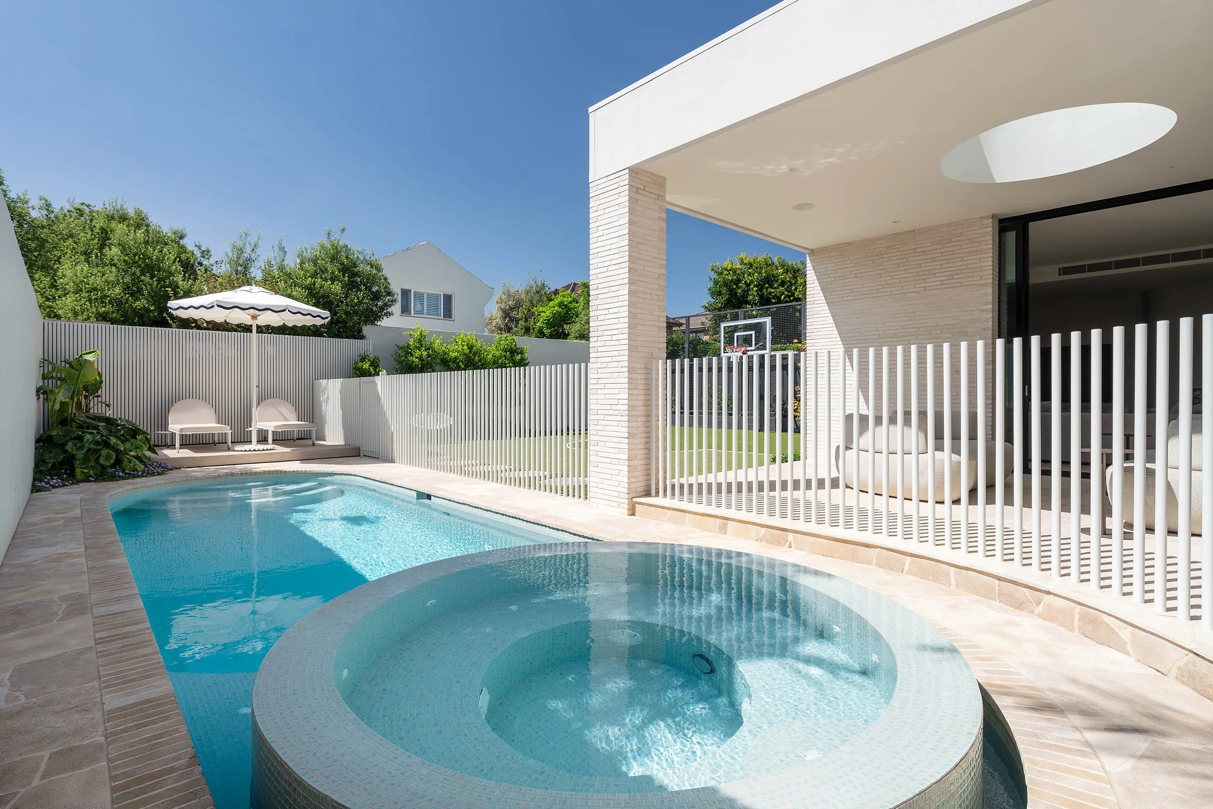 Aimee’s signature aesthetic carries seamlessly into the outdoor spaces, where colour and texture continue the story established within the home. Hardscape selections were made not only for durability, but for their ability to connect back to the interior palette.